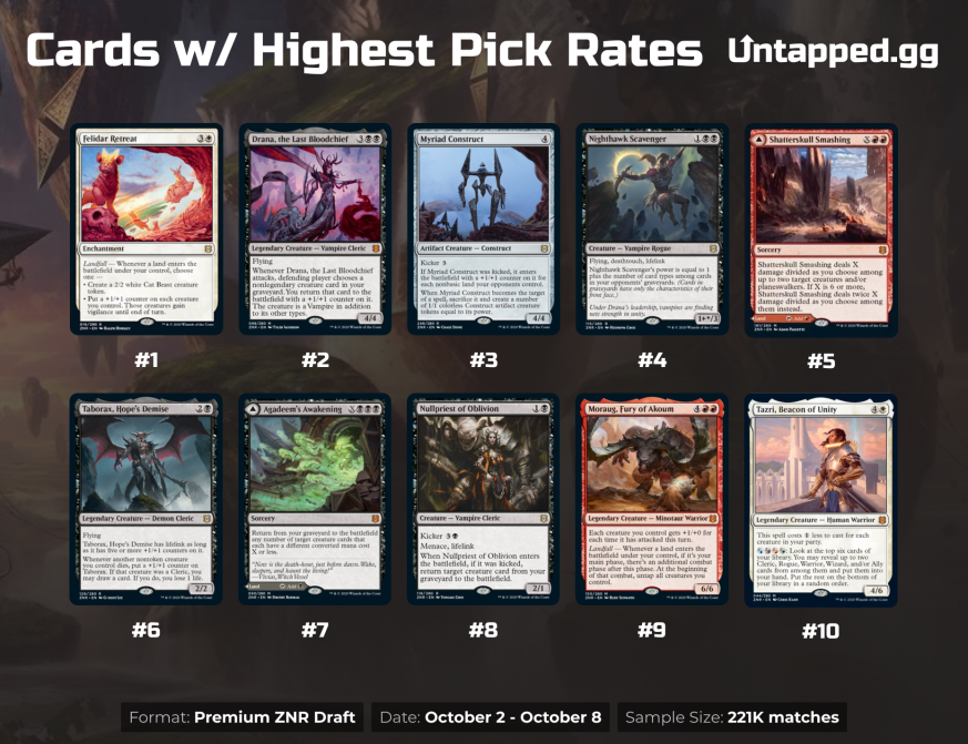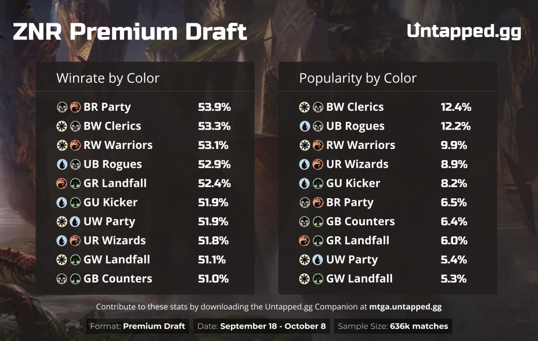 I previously wrote about Zendikar Rising Limited on my personal blog and am pleased to be able to expand on my earlier insights here. In this article, I will be using the data I have on hand to analyze the Zendikar Rising Premium Draft metagame. My data set for this article is all Gold+ games of ZNR Premium Draft that have been tracked by the Untapped.gg Companion as of October 8th.